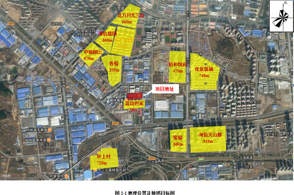 本项目位于烟台经济技术开发区F-12小区,地理位置、敏感目标如图2-1所示,厂区的平面布置如图2-2所示。 4.环境保护目标 本项目距离最近的敏感点位为富饶世家,距离厂界约20m。厂界1km范围内环境保护目标如表2-2所示: 表2-2环境保护目标一览表