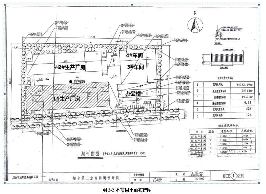 1.项目概况 烟台旭阳塑料有限公司年产周转箱、渔需系列50万个,给水用聚氯乙烯管件30万件,给水用聚乙烯管件10万件,ABS深水浮20万件项目环评设计主体工程为1#生产厂房、2#生产厂房、3#车间、4#车间,共布设28台注塑机,8台高速混合机。项目采取分期验收方式。 本次验收项目为烟台旭阳塑料有限公司年产周转箱、渔需系列50万个,给水用聚氯乙烯管件30万件,给水用聚乙烯管件10万件,ABS深水浮20万件一期项目,本项目位于烟台经济技术开发区F-12小区,占地面积为24382.28m2。主体工程4个厂房/车间均已建成,其中,2#生产厂房及4#车间均外租,3#车间目前暂用作仓库使用,生产设备集中在1#生产厂房内,共布设塑料注塑机22台、高速混合机8台,生产规模为年产周转箱、渔需系列50万个、给水用聚氯乙烯管件10万件、给水用聚乙烯管件10万件、ABS深水浮20万件,配套建设办公楼等。实际总投资6000万元,其中环保投资20万元,占总投资比例的0.3%。 烟台旭阳塑料有限公司于2005年11月委托烟台市环境保护科学研究所编制了《烟台旭阳塑料有限公司年产周转箱、渔需系列50万个,给水用聚氯乙烯管件30万件,给水用聚乙烯管件10万件,ABS深水浮20万件项目环境影响报告表》,2005年12月23日烟台市开发区环境保护局以烟开环表批字[2005]31号文《关于烟台旭阳塑料有限公司年产周转箱、渔需系列50万个,给水用聚氯乙烯管件30万件,给水用聚乙烯管件10万件,ABS深水浮20万件项目环境影响报告表的批复》对本项目进行了批复。 本项目于2005年12月开工建设,2014年8月基本建设完成。项目劳动定员150人,年工作时间330天,实行3班工作制,每班工作8小时。 2.主要建设内容 本项目1#生产厂房、2#生产厂房、3#车间、4#车间均已建成,2#生产厂房及4#车间均已外租,3#车间目前暂用作仓库使用,生产设备集中在1#生产厂房内,主要建(构)筑物详见表2-1。 表2-1主要建设内容