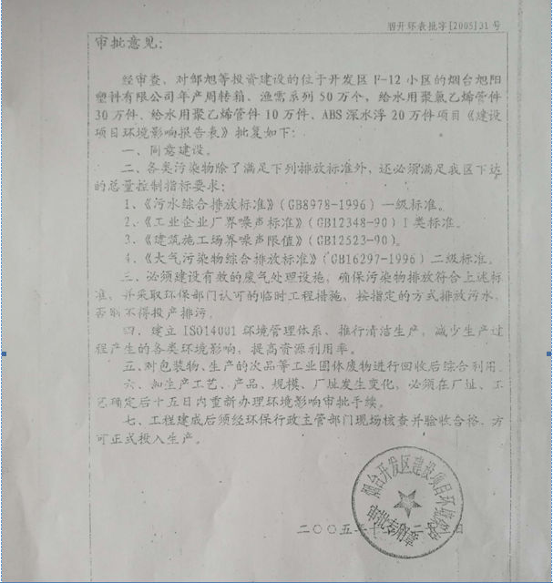 1、环保审批手续及“三同时”执行情况 根据国家《建设项目环境保护管理条例》中的有关规定,2005年11月由烟台市环境保护科学研究所对该项目进行了环境影响评价,编制完成了《烟台旭阳塑料有限公司年产周转箱、渔需系列50万个,给水用聚氯乙烯管件30万件,给水用聚乙烯管件10万件,ABS深水浮20万件项目环境影响报告表》,2005年12月23日,烟台市开发区环境保护局对该报告表进行了批复(烟开环表批字[2015]31号)。 该项目在建设过程中,基本执行了国家有关环保法律法规的要求,按照环评批复要求进行设计、施工和试生产,满足了环保设施与主体工程同时设计、同时施工、同时投产使用的“三同时”要求。 2、环境管理规章制度的建立及其执行情况 按照各级环保部门要求,烟台旭阳塑料有限公司认真落实环境保护工作责任制,完善环保制度,制订了环境保护管理制度,规定了环境保护机构与管理职责、环保设施管理规定、污染事故管理。各环保设施岗位运行维护情况均建立了有关记录,将环保管理具体责任落实到人。 3、环保机构设置、人员的配置情况 烟台旭阳塑料有限公司实行环境保护责任制,环境安全由设备部主管,配备兼职环保人员1名负责企业治污,组织本单位职工专业技能培训,确保职工按照岗位操作规程进行操作,避免因错误或习惯性操作引发环境污染事故。 4、环保设施运行调查,维护情况 烟台旭阳塑料有限公司在重要环保岗位均建立了环保设施运行报表,编制设施操作规程和岗位标准,环保设施规范操作。同时公司对环保设施实行检查、总结、统计。确保环保设施、设备与生产系统同时投用、同时运行。 5、环境风险防范情况 本项目主要原料为聚乙烯、聚丙烯塑料,其风险主要为火灾。对此,建设单位制定强化 了安全生产及环境保护意识的教育,定期对操作人员进行安全生产、消防、环保、工业卫生等方面的技术培训教育;定期对消防设施检查,保证消防设施的有效性。 ![]() |